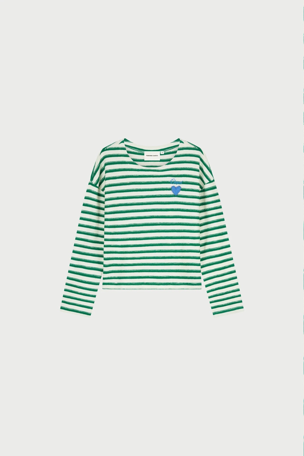 Style Details: Fresh, feel-good, and effortlessly charming — the Celina Top is your new everyday favourite! Featuring crisp horizontal green and white stripes, a playful blue heart detail at the front, round neck, long sleeves, and crafted from 100% organic cotton, it offers a soft, breathable feel with a relaxed, loose fit for all-day comfort.