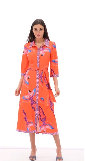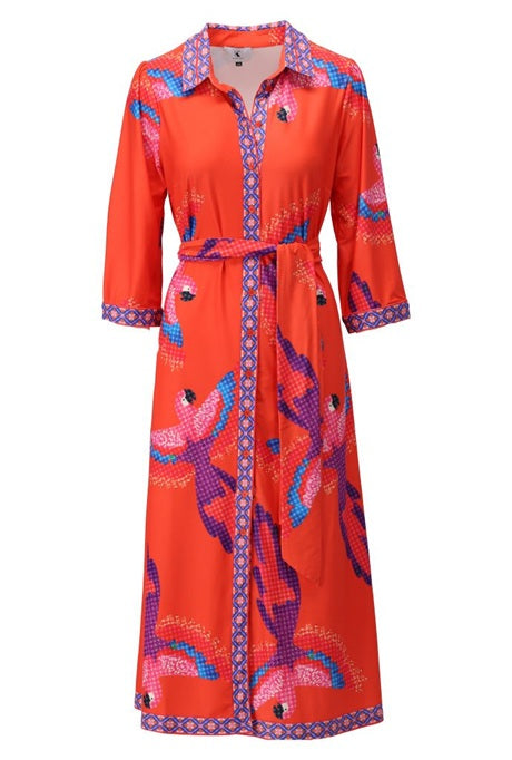 Style Details: Make a bold statement in this red shirt dress, where vibrant energy meets effortless elegance! Featuring a collar, 3/4 length sleeves with buttoned cuffs, button-front, cinched at the waist with a coordinating belt for a flattering silhouette, and eye-catching red print, adorned with playful parrots. Perfect for brunches, garden parties, or sunlit strolls, this dress combines comfort, style, and standout personality in every step!