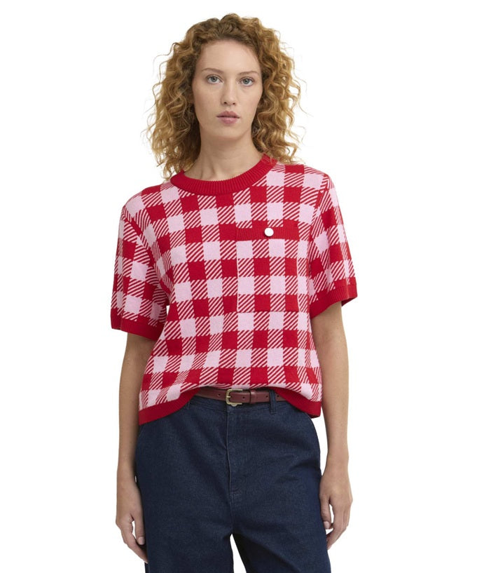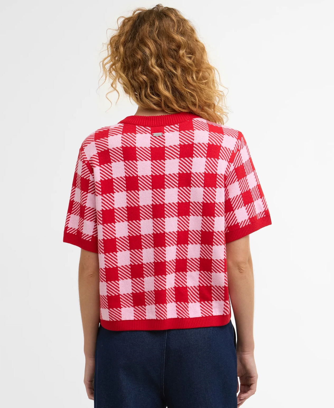 Style Details: The Esther Gingham Crew Neck Jumper is a versatile layering essential for modern wardrobes! Crafted in a gingham jacquard knit, it features a crew neck, relaxed, boxy silhouette with ribbed trims, short sleeves, a practical patch pocket accented by a Barbour-branded button, and a slim metal ID bar at the back neck. This jumper delivers contemporary style with subtle signature details, making it a chic, comfortable choice for everyday wear!