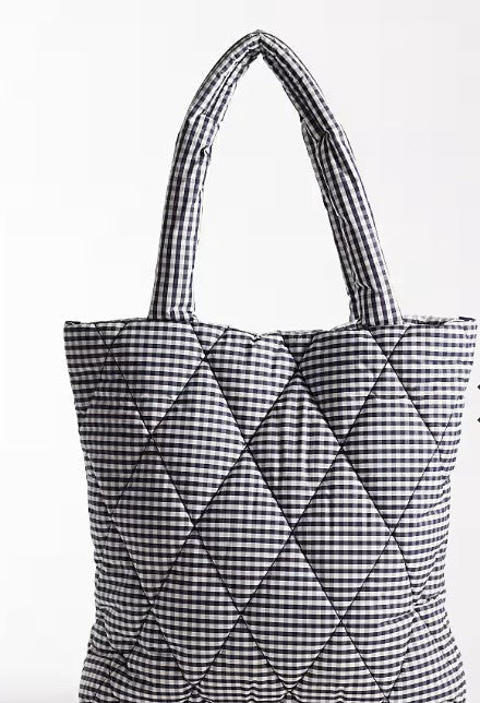 Style Details: Fresh, playful, and effortlessly polished, the Riah Quilted Tote Bag, in Navy/White Gingham Check brings timeless charm to your everyday routine! Featuring a signature branded patch, twin straps for comfortable carry, and the softly quilted design adds texture and structure. This tote bag is the perfect blend of practicality and standout style!
