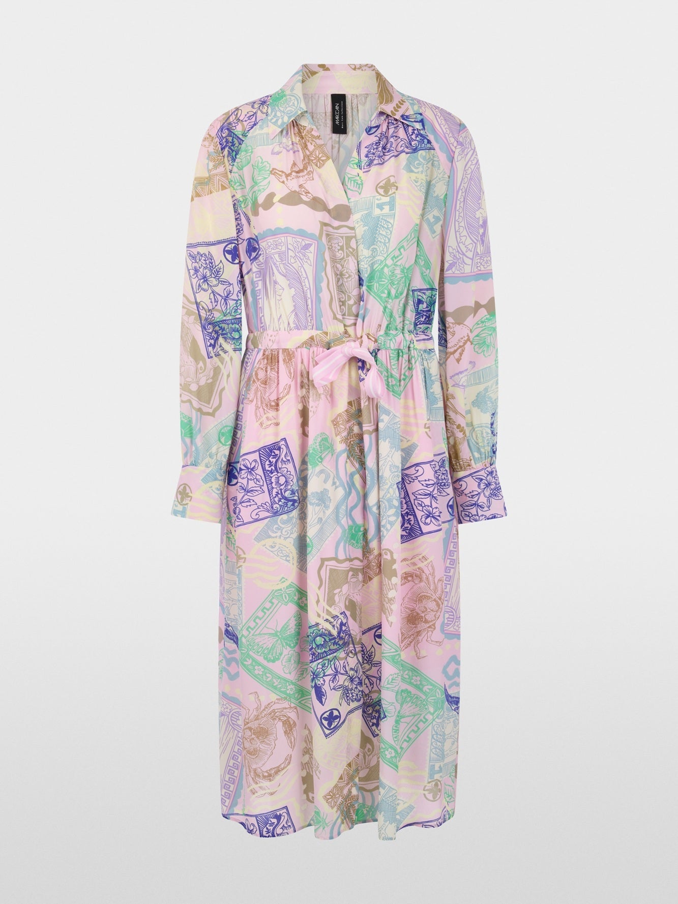 Style Details: Exude elegance in this calf-length dress crafted from a luxurious viscose-silk blend, adorned with an exclusive stamp print, the flowing skirt and integrated tie belt accentuate the waist, creating a beautifully feminine silhouette, while the lined skirt ensures comfort and ease of movement, wide buttoned cuffs and a V-neck with a full-length button row add modern sophistication, making this dress perfect for both special occasions and stylish everyday wear.