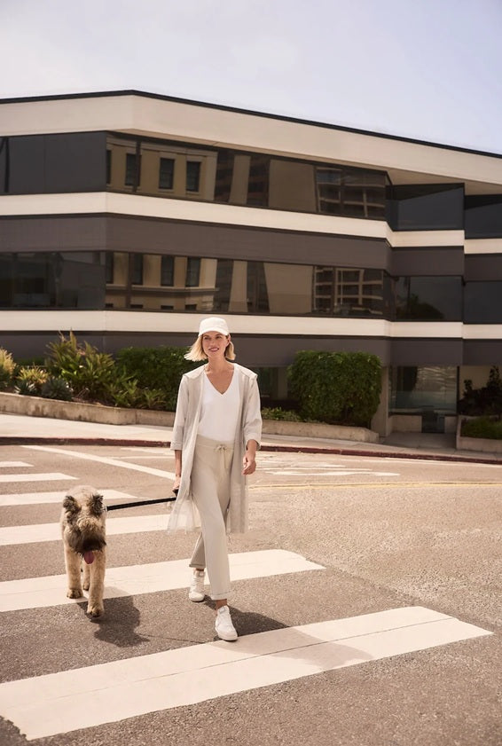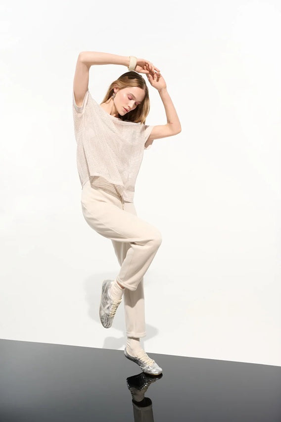 Style Details: This moonstone jogger is crafted from a stretchy soft jersey fabric and structured fit of scuba, features an elastic waistband, adjustable drawstring finished with metal tips, unlined, an effortless pull-on silhouette, a 26" inseam, seamlessly taking you from the office to off-duty lounging. Pair with our vanilla/moonstone striped knit top and trainers for a casual look!