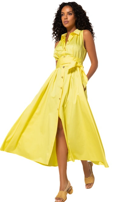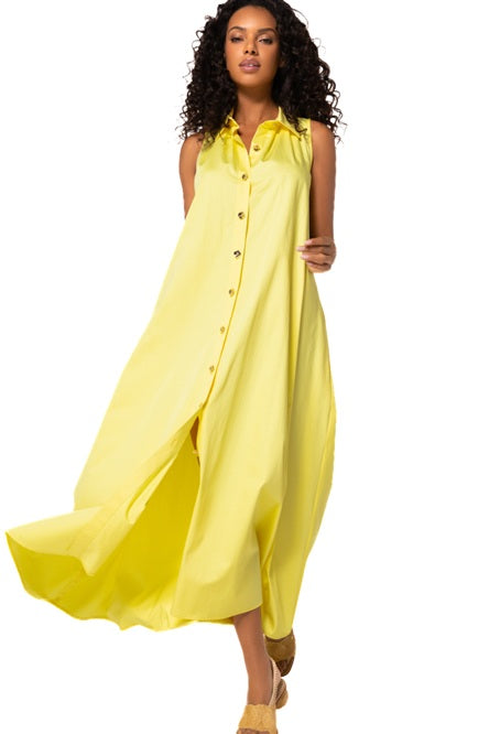 Style Details: Shine bright this Summer with this stunning yellow dress by Caroline Biss! Made from 100% breathable cotton, unlined, drapes naturally for a relaxed yet flattering fit, sleeveless, collar, button front, coordinating belt, slit side pockets, and the midi length ensures versatile, day-to-night wear. Bright, breezy, and beautifully simple, this dress is the perfect wardrobe staple for warm-weather occasions!