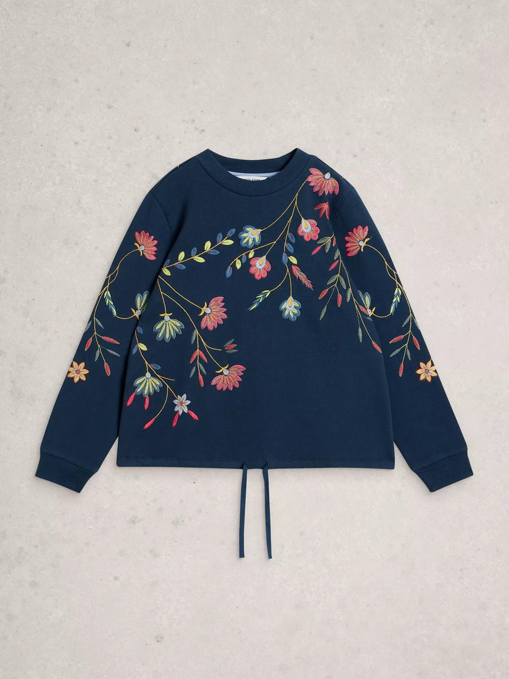 Style Details: Brighten your spring wardrobe with this Floral Embroidered Sweater in Navy Multi. Made from perfectly soft organic cotton, this sweatshirt features a crew neck, long sleeves, a comfortable regular fit, a drawstring hem that adds subtle shape, while delicate embroidered blooms bring a touch of seasonal charm. Pair with jeans and mules to welcome the first flowers of spring in effortless style!